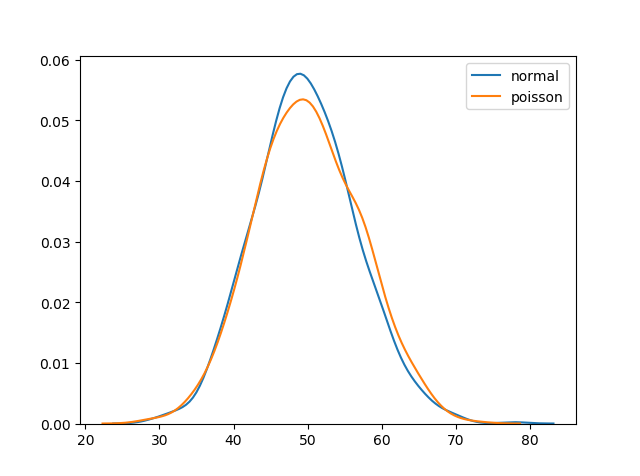 但对于非常大的 n 和接近于零的 p,二项式分布几乎与泊松分布相同,因此 n * p 几乎等于 lam。