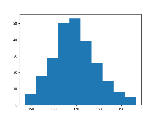 # 以下三行代码使编译器支持绘图功能: import sys import matplotlib matplotlib.use('Agg') import matplotlib.pyplot as plt import numpy as np # 生成正态分布数据: x = np.random.normal(170, 10, 250) # 均值 170,标准差 10,250 个数据点 # 绘制直方图: plt.hist(x) # 创建直方图 plt.show() # 显示图表 # 以下两行代码使编译器能够输出图形: plt.savefig(sys.stdout.buffer) sys.stdout.flush()