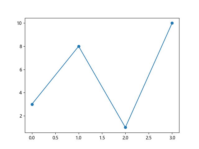 # 这三行代码使编译器能够绘图: import sys import matplotlib matplotlib.use('Agg') import matplotlib.pyplot as plt import numpy as np ypoints = np.array([3, 8, 1, 10]) # 使用圆形标记绘制 plt.plot(ypoints, marker = 'o') plt.show() # 这两行代码使编译器能够输出图形: plt.savefig(sys.stdout.buffer) sys.stdout.flush()