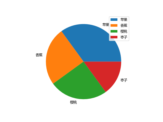 # 这三行代码让编译器支持绘图功能: import sys import matplotlib matplotlib.use('Agg') import matplotlib.pyplot as plt import numpy as np # 创建饼图数据: y = np.array([35, 25, 25, 15]) # 各部分占比值 mylabels = ["苹果", "香蕉", "樱桃", "枣子"] # 各部分标签 # 绘制饼图: plt.pie(y, labels = mylabels) # 绘制带标签的饼图 plt.legend() # 添加图例 plt.show() # 显示图表 # 这两行代码让编译器可以输出图形: plt.savefig(sys.stdout.buffer) sys.stdout.flush()