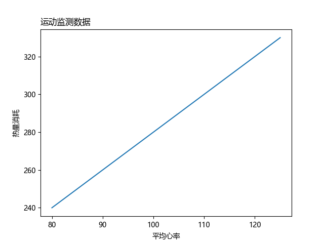 # 这三行代码使编译器能够绘图: import sys import matplotlib matplotlib.use('Agg') import numpy as np import matplotlib.pyplot as plt # 准备运动数据(心率和卡路里): x = np.array([80, 85, 90, 95, 100, 105, 110, 115, 120, 125]) y = np.array([240, 250, 260, 270, 280, 290, 300, 310, 320, 330]) plt.title("运动监测数据", loc = 'left') # 标题左对齐 plt.xlabel("平均心率") # X 轴标签 plt.ylabel("热量消耗") # Y 轴标签 plt.plot(x, y) # 绘制折线图 plt.show() # 显示图表 # 这两行代码使编译器能够输出图形: plt.savefig(sys.stdout.buffer) sys.stdout.flush()