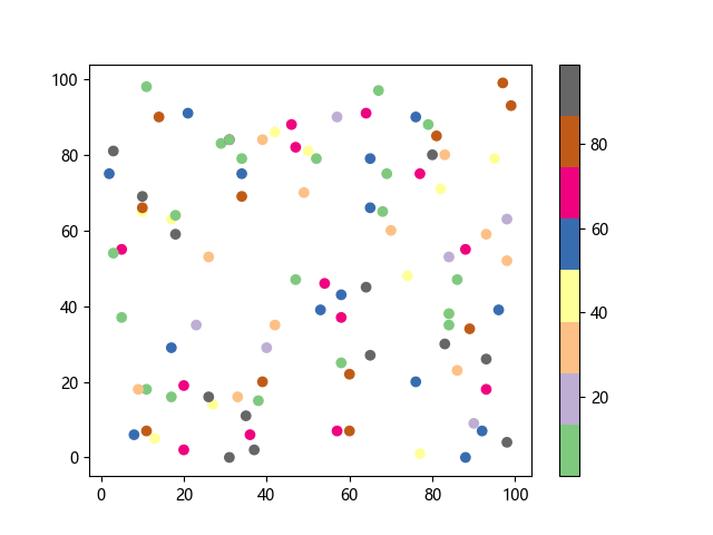 # 这三行代码使编译器能够绘图: import sys import matplotlib matplotlib.use('Agg') import matplotlib.pyplot as plt import numpy as np x = np.random.randint(100, size=(100)) y = np.random.randint(100, size=(100)) colors = np.random.randint(100, size=(100)) # 使用强调色系绘制散点图: plt.scatter(x, y, c=colors, cmap='Accent') plt.colorbar() plt.show() # 这两行代码使编译器能够输出图形: plt.savefig(sys.stdout.buffer) sys.stdout.flush()