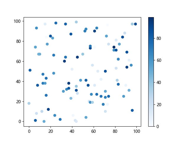 # 这三行代码使编译器能够绘图: import sys import matplotlib matplotlib.use('Agg') import matplotlib.pyplot as plt import numpy as np x = np.random.randint(100, size=(100)) y = np.random.randint(100, size=(100)) colors = np.random.randint(100, size=(100)) # 使用蓝色渐变绘制散点图: plt.scatter(x, y, c=colors, cmap='Blues') plt.colorbar() # 显示颜色条 plt.show() # 显示图形 # 这两行代码使编译器能够输出图形: plt.savefig(sys.stdout.buffer) sys.stdout.flush()
