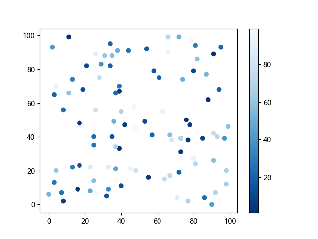 # 这三行代码使编译器能够绘图: import sys import matplotlib matplotlib.use('Agg') import matplotlib.pyplot as plt import numpy as np x = np.random.randint(100, size=(100)) y = np.random.randint(100, size=(100)) colors = np.random.randint(100, size=(100)) # 使用反向蓝色渐变绘制散点图: plt.scatter(x, y, c=colors, cmap='Blues_r') plt.colorbar() # 显示颜色条 plt.show() # 显示图形 # 这两行代码使编译器能够输出图形: plt.savefig(sys.stdout.buffer) sys.stdout.flush()