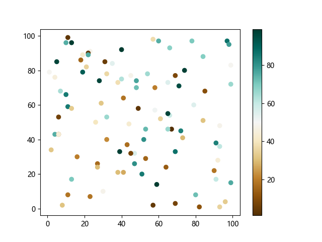 # 这三行代码使编译器能够绘图: import sys import matplotlib matplotlib.use('Agg') import matplotlib.pyplot as plt import numpy as np x = np.random.randint(100, size=(100)) y = np.random.randint(100, size=(100)) colors = np.random.randint(100, size=(100)) # 使用棕蓝绿渐变绘制散点图: plt.scatter(x, y, c=colors, cmap='BrBG') plt.colorbar() # 显示颜色条 plt.show() # 显示图形 # 这两行代码使编译器能够输出图形: plt.savefig(sys.stdout.buffer) sys.stdout.flush()
