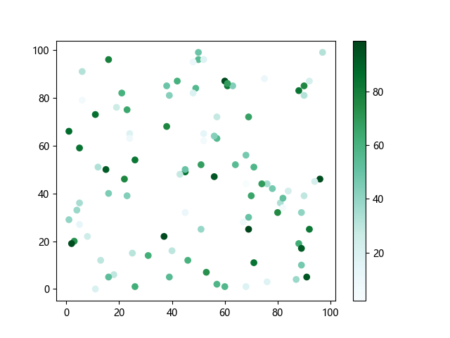 # 这三行代码使编译器能够绘图: import sys import matplotlib matplotlib.use('Agg') import matplotlib.pyplot as plt import numpy as np x = np.random.randint(100, size=(100)) y = np.random.randint(100, size=(100)) colors = np.random.randint(100, size=(100)) # 使用蓝绿色渐变绘制散点图: plt.scatter(x, y, c=colors, cmap='BuGn') plt.colorbar() # 显示颜色条 plt.show() # 显示图形 # 这两行代码使编译器能够输出图形: plt.savefig(sys.stdout.buffer) sys.stdout.flush()