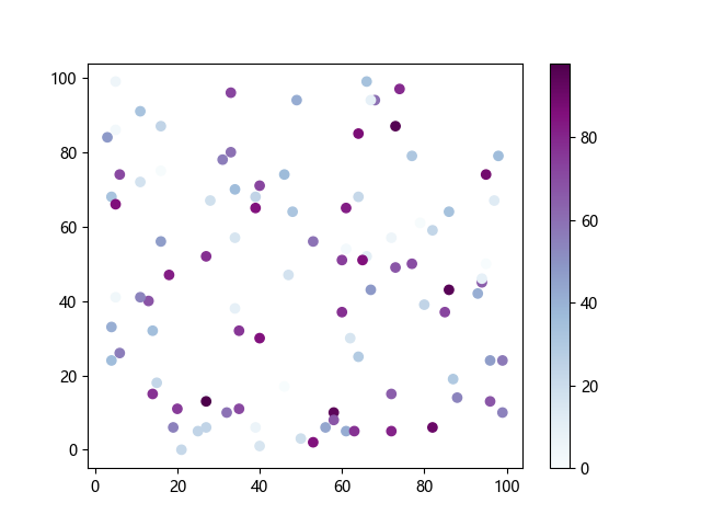 # 这三行代码使编译器能够绘图: import sys import matplotlib matplotlib.use('Agg') import matplotlib.pyplot as plt import numpy as np x = np.random.randint(100, size=(100)) y = np.random.randint(100, size=(100)) colors = np.random.randint(100, size=(100)) # 使用蓝紫色渐变绘制散点图: plt.scatter(x, y, c=colors, cmap='BuPu') plt.colorbar() # 显示颜色条 plt.show() # 显示图形 # 这两行代码使编译器能够输出图形: plt.savefig(sys.stdout.buffer) sys.stdout.flush()