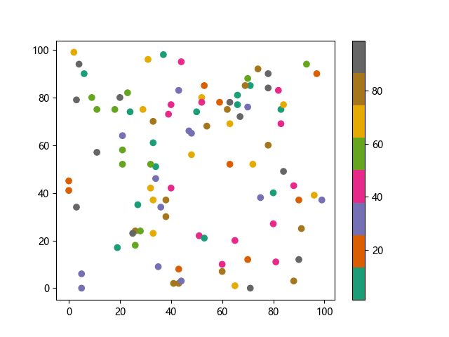 # 这三行代码使编译器能够绘图: import sys import matplotlib matplotlib.use('Agg') import matplotlib.pyplot as plt import numpy as np x = np.random.randint(100, size=(100)) y = np.random.randint(100, size=(100)) colors = np.random.randint(100, size=(100)) # 使用 Dark2 配色方案绘制散点图: plt.scatter(x, y, c=colors, cmap='Dark2') plt.colorbar() plt.show() # 这两行代码使编译器能够输出图形: plt.savefig(sys.stdout.buffer) sys.stdout.flush()