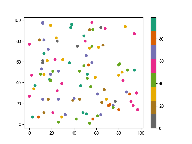 # 这三行代码使编译器能够绘图: import sys import matplotlib matplotlib.use('Agg') import matplotlib.pyplot as plt import numpy as np x = np.random.randint(100, size=(100)) y = np.random.randint(100, size=(100)) colors = np.random.randint(100, size=(100)) # 使用反向 Dark2 配色方案绘制散点图: plt.scatter(x, y, c=colors, cmap='Dark2_r') plt.colorbar() plt.show() # 这两行代码使编译器能够输出图形: plt.savefig(sys.stdout.buffer) sys.stdout.flush()