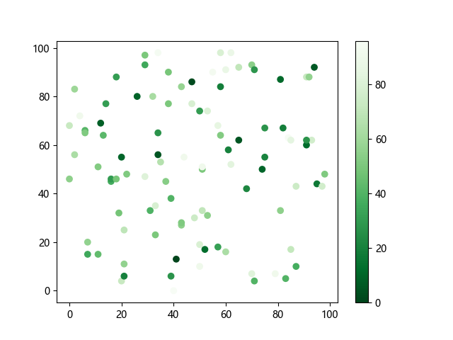 # 这三行代码使编译器能够绘图: import sys import matplotlib matplotlib.use('Agg') import matplotlib.pyplot as plt import numpy as np x = np.random.randint(100, size=(100)) y = np.random.randint(100, size=(100)) colors = np.random.randint(100, size=(100)) # 使用反向绿色渐变绘制散点图: plt.scatter(x, y, c=colors, cmap='Greens_r') plt.colorbar() plt.show() # 这两行代码使编译器能够输出图形: plt.savefig(sys.stdout.buffer) sys.stdout.flush()