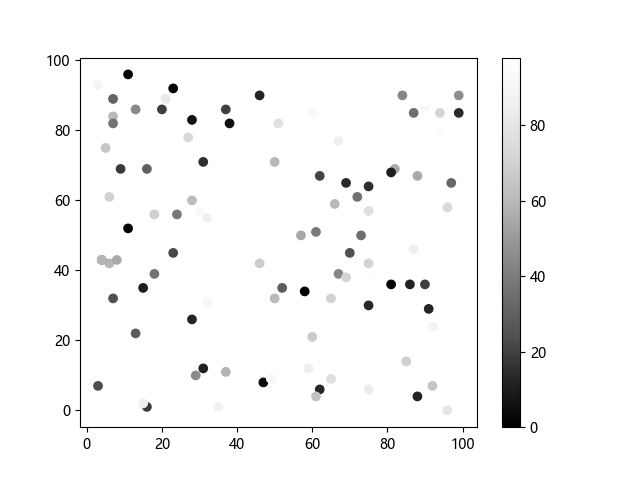 # 这三行代码使编译器能够绘图: import sys import matplotlib matplotlib.use('Agg') import matplotlib.pyplot as plt import numpy as np x = np.random.randint(100, size=(100)) y = np.random.randint(100, size=(100)) colors = np.random.randint(100, size=(100)) # 使用反向灰度渐变绘制散点图: plt.scatter(x, y, c=colors, cmap='Greys_r') plt.colorbar() plt.show() # 这两行代码使编译器能够输出图形: plt.savefig(sys.stdout.buffer) sys.stdout.flush()