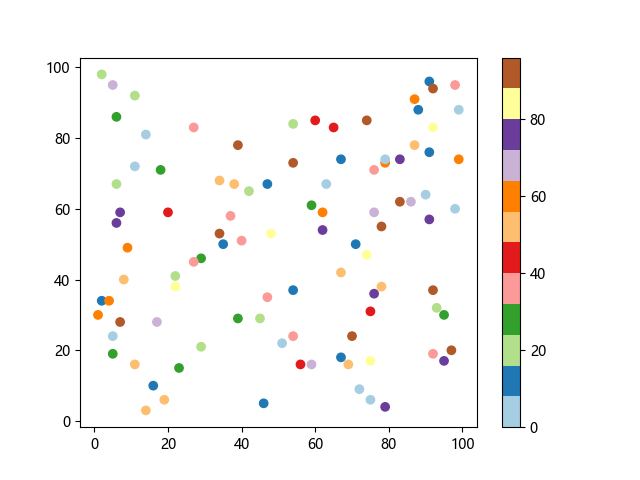 # 这三行代码使编译器能够绘图: import sys import matplotlib matplotlib.use('Agg') import matplotlib.pyplot as plt import numpy as np x = np.random.randint(100, size=(100)) y = np.random.randint(100, size=(100)) colors = np.random.randint(100, size=(100)) # 使用配对色系绘制散点图: plt.scatter(x, y, c=colors, cmap='Paired') plt.colorbar() plt.show() # 这两行代码使编译器能够输出图形: plt.savefig(sys.stdout.buffer) sys.stdout.flush()