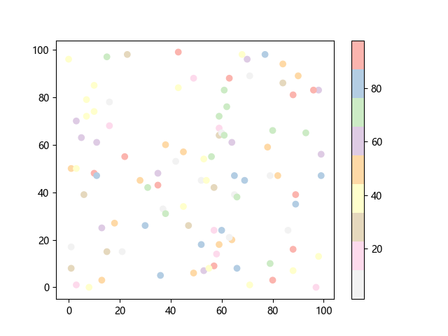 # 这三行代码使编译器能够绘图: import sys import matplotlib matplotlib.use('Agg') import matplotlib.pyplot as plt import numpy as np x = np.random.randint(100, size=(100)) y = np.random.randint(100, size=(100)) colors = np.random.randint(100, size=(100)) # 绘制反向 Pastel1 配色方案的散点图: plt.scatter(x, y, c=colors, cmap='Pastel1_r') plt.colorbar() plt.show() # 这两行代码使编译器能够输出图形: plt.savefig(sys.stdout.buffer) sys.stdout.flush()