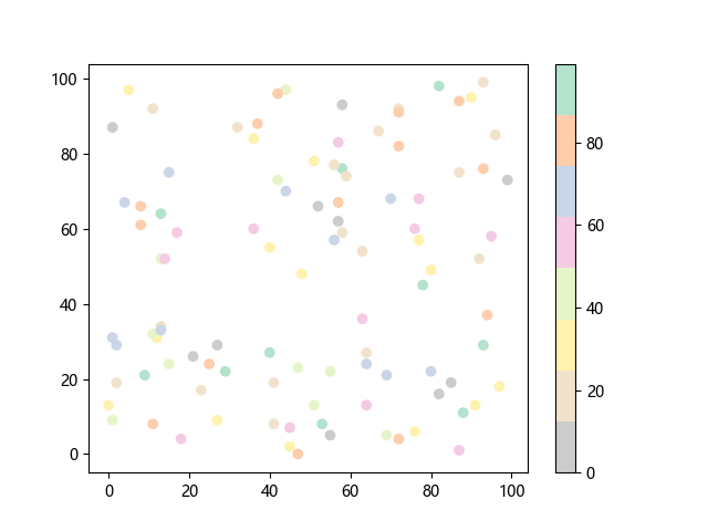 # 这三行代码使编译器能够绘图: import sys import matplotlib matplotlib.use('Agg') import matplotlib.pyplot as plt import numpy as np # 生成 100 个随机 x 坐标: x = np.random.randint(100, size=(100)) # 生成 100 个随机 y 坐标: y = np.random.randint(100, size=(100)) # 生成 100 个随机颜色值: colors = np.random.randint(100, size=(100)) # 绘制彩色散点图 plt.scatter(x, y, c=colors, cmap='Pastel2_r') plt.colorbar() # 显示颜色条 plt.show() # 显示图形 # 这两行代码使编译器能够输出图形: plt.savefig(sys.stdout.buffer) sys.stdout.flush()