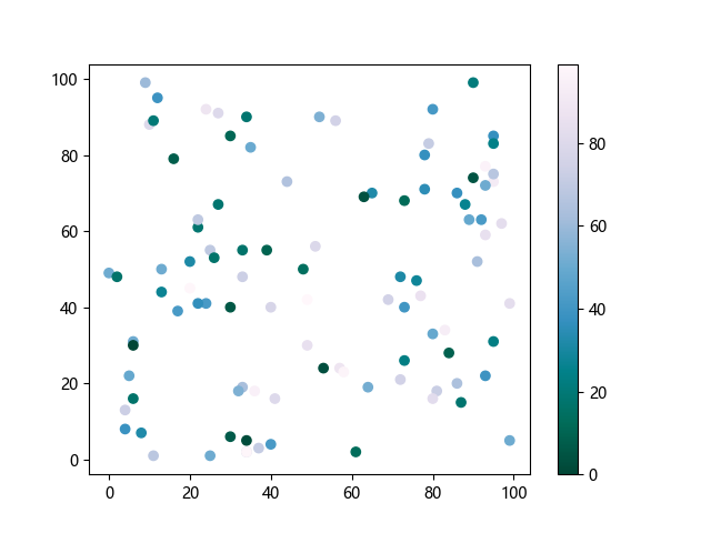 # 这三行代码使编译器能够绘图: import sys import matplotlib matplotlib.use('Agg') import matplotlib.pyplot as plt import numpy as np # 生成随机数据: x = np.random.randint(100, size=(100)) y = np.random.randint(100, size=(100)) colors = np.random.randint(100, size=(100)) # 使用 PuBuGn_r 配色方案绘制紫蓝绿反向渐变色散点图: plt.scatter(x, y, c=colors, cmap='PuBuGn_r') plt.colorbar() # 显示颜色条 plt.show() # 显示图形 # 这两行代码使编译器能够输出图形: plt.savefig(sys.stdout.buffer) sys.stdout.flush()