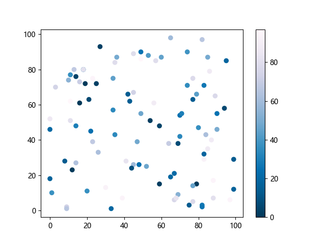 # 这三行代码使编译器能够绘图: import sys import matplotlib matplotlib.use('Agg') import matplotlib.pyplot as plt import numpy as np # 生成随机数据: x = np.random.randint(100, size=(100)) y = np.random.randint(100, size=(100)) colors = np.random.randint(100, size=(100)) # 使用 PuBu_r 配色方案绘制紫蓝色反向渐变色散点图: plt.scatter(x, y, c=colors, cmap='PuBu_r') plt.colorbar() # 显示颜色条 plt.show() # 显示图形 # 这两行代码使编译器能够输出图形: plt.savefig(sys.stdout.buffer) sys.stdout.flush()