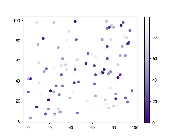 # 这三行代码使编译器能够绘图: import sys import matplotlib matplotlib.use('Agg') import matplotlib.pyplot as plt import numpy as np # 生成随机数据: x = np.random.randint(100, size=(100)) y = np.random.randint(100, size=(100)) colors = np.random.randint(100, size=(100)) # 使用 Purples_r 配色方案绘制紫色反向渐变色散点图: plt.scatter(x, y, c=colors, cmap='Purples_r') plt.colorbar() # 显示颜色条 plt.show() # 显示图形 # 这两行代码使编译器能够输出图形: plt.savefig(sys.stdout.buffer) sys.stdout.flush()