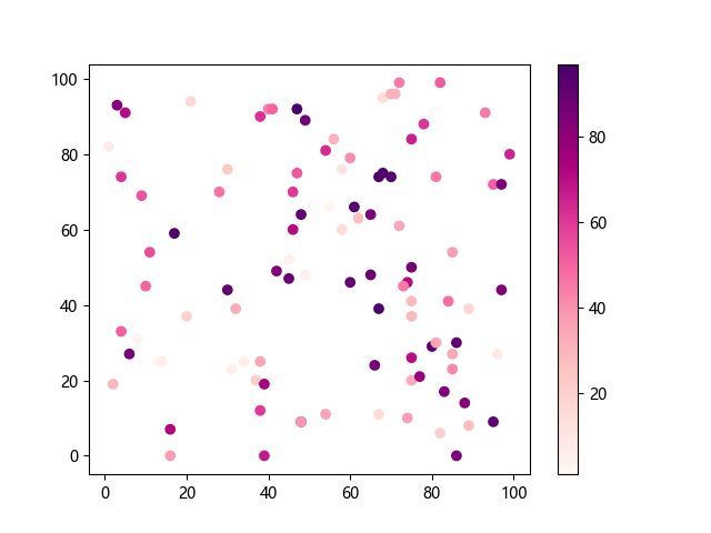 # 这三行代码使编译器能够绘图: import sys import matplotlib matplotlib.use('Agg') import matplotlib.pyplot as plt import numpy as np # 生成随机数据 x = np.random.randint(100, size=(100)) y = np.random.randint(100, size=(100)) colors = np.random.randint(100, size=(100)) # 使用 RdPu 配色方案绘制红紫色渐变色散点图: plt.scatter(x, y, c=colors, cmap='RdPu') plt.colorbar() # 显示颜色条 plt.show() # 显示图形 # 这两行代码使编译器能够输出图形: plt.savefig(sys.stdout.buffer) sys.stdout.flush()