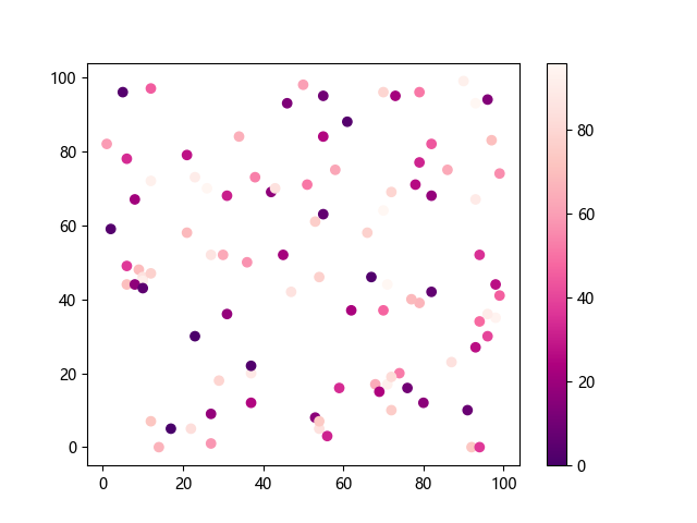 # 这三行代码使编译器能够绘图: import sys import matplotlib matplotlib.use('Agg') import matplotlib.pyplot as plt import numpy as np # 生成随机数据: x = np.random.randint(100, size=(100)) y = np.random.randint(100, size=(100)) colors = np.random.randint(100, size=(100)) # 使用 RdPu_r 配色方案绘制红紫色反向渐变色散点图: plt.scatter(x, y, c=colors, cmap='RdPu_r') plt.colorbar() # 显示颜色条 plt.show() # 显示图形 # 这两行代码使编译器能够输出图形: plt.savefig(sys.stdout.buffer) sys.stdout.flush()
