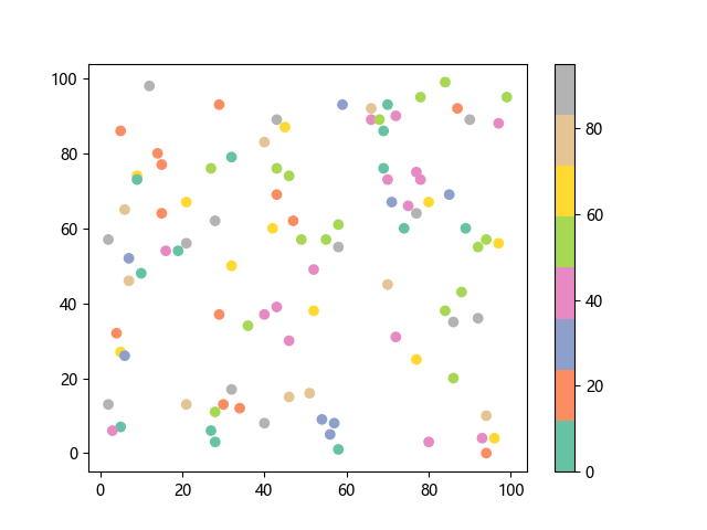 # 这三行代码使编译器能够绘图: import sys import matplotlib matplotlib.use('Agg') import matplotlib.pyplot as plt import numpy as np # 生成随机数据: x = np.random.randint(100, size=(100)) y = np.random.randint(100, size=(100)) colors = np.random.randint(100, size=(100)) # 使用 Set2 (8 色调色板)配色方案绘制 Set2 离散色散点图: plt.scatter(x, y, c=colors, cmap='Set2') plt.colorbar() # 显示颜色条 plt.show() # 显示图形 # 这两行代码使编译器能够输出图形: plt.savefig(sys.stdout.buffer) sys.stdout.flush()