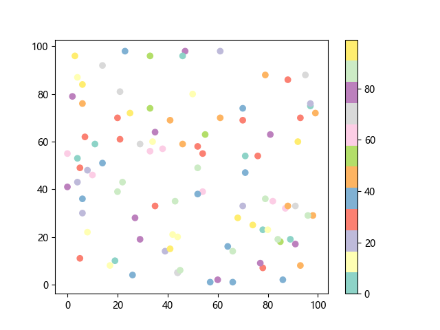 # 这三行代码使编译器能够绘图: import sys import matplotlib matplotlib.use('Agg') import matplotlib.pyplot as plt import numpy as np # 生成随机数据: x = np.random.randint(100, size=(100)) y = np.random.randint(100, size=(100)) colors = np.random.randint(100, size=(100)) # 使用 Set3 (12 色调色板)配色方案绘制 Set3 离散色散点图: plt.scatter(x, y, c=colors, cmap='Set3') plt.colorbar() # 显示颜色条 plt.show() # 显示图形 # 这两行代码使编译器能够输出图形: plt.savefig(sys.stdout.buffer) sys.stdout.flush()