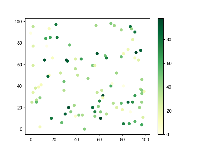 # 这三行代码使编译器能够绘图: import sys import matplotlib matplotlib.use('Agg') import matplotlib.pyplot as plt import numpy as np # 生成随机数据: x = np.random.randint(100, size=(100)) y = np.random.randint(100, size=(100)) colors = np.random.randint(100, size=(100)) # 使用 YlGn (黄-绿渐变)配色方案绘制散点图: plt.scatter(x, y, c=colors, cmap='YlGn') plt.colorbar() # 显示颜色条 plt.show() # 显示图形 # 这两行代码使编译器能够输出图形: plt.savefig(sys.stdout.buffer) sys.stdout.flush()