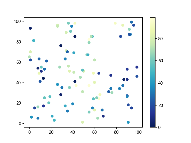 # 这三行代码使编译器能够绘图: import sys import matplotlib matplotlib.use('Agg') import matplotlib.pyplot as plt import numpy as np # 生成随机数据点: x = np.random.randint(100, size=(100)) y = np.random.randint(100, size=(100)) colors = np.random.randint(100, size=(100)) # 使用 YlGnBu_r (黄-绿-蓝反向渐变)配色方案绘制散点图: plt.scatter(x, y, c=colors, cmap='YlGnBu_r') plt.colorbar() # 显示颜色条 plt.show() # 显示图形 # 这两行代码使编译器能够输出图形: plt.savefig(sys.stdout.buffer) sys.stdout.flush()