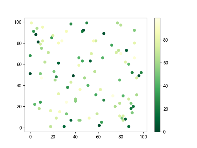 # 这三行代码使编译器能够绘图: import sys import matplotlib matplotlib.use('Agg') import matplotlib.pyplot as plt import numpy as np # 生成随机数据: x = np.random.randint(100, size=(100)) y = np.random.randint(100, size=(100)) colors = np.random.randint(100, size=(100)) # 使用YlGn_r(黄-绿反向渐变)配色方案绘制散点图: plt.scatter(x, y, c=colors, cmap='YlGn_r') plt.colorbar() # 显示颜色条 plt.show() # 显示图形 # 这两行代码使编译器能够输出图形: plt.savefig(sys.stdout.buffer) sys.stdout.flush()
