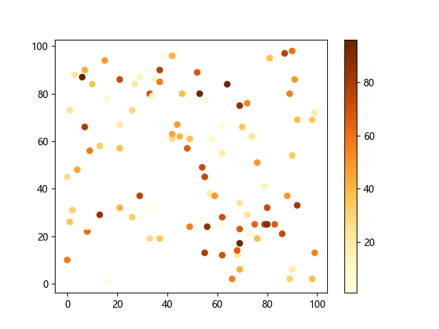 # 这三行代码使编译器能够绘图: import sys import matplotlib matplotlib.use('Agg') import matplotlib.pyplot as plt import numpy as np # 生成随机数据: x = np.random.randint(100, size=(100)) y = np.random.randint(100, size=(100)) colors = np.random.randint(100, size=(100)) # 使用 YlOrBr (黄-橙-棕渐变)配色方案绘制黄橙棕渐变散点图: plt.scatter(x, y, c=colors, cmap='YlOrBr') plt.colorbar() # 显示颜色条 plt.show() # 显示图形 # 这两行代码使编译器能够输出图形: plt.savefig(sys.stdout.buffer) sys.stdout.flush()
