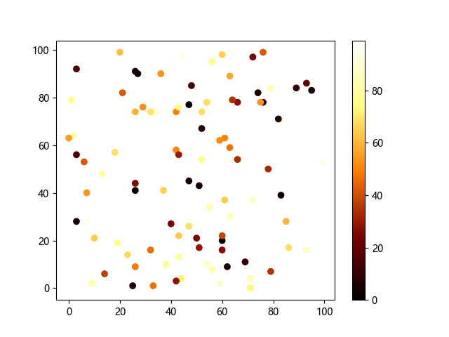 # 这三行代码使编译器能够绘图: import sys import matplotlib matplotlib.use('Agg') import matplotlib.pyplot as plt import numpy as np # 生成随机数据: x = np.random.randint(100, size=(100)) y = np.random.randint(100, size=(100)) colors = np.random.randint(100, size=(100)) # 使用 afmhot (热金属)配色方案绘制热金属色散点图: plt.scatter(x, y, c=colors, cmap='afmhot') plt.colorbar() # 显示颜色条 plt.show() # 显示图形 # 这两行代码使编译器能够输出图形: plt.savefig(sys.stdout.buffer) sys.stdout.flush()