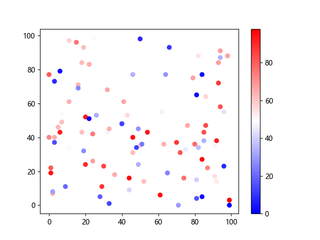 # 这三行代码使编译器能够绘图: import sys import matplotlib matplotlib.use('Agg') import matplotlib.pyplot as plt import numpy as np # 生成随机数据 x = np.random.randint(100, size=(100)) y = np.random.randint(100, size=(100)) colors = np.random.randint(100, size=(100)) # 使用 bwr 配色方案绘制蓝白红渐变色散点图: plt.scatter(x, y, c=colors, cmap='bwr') plt.colorbar() plt.show() # 这两行代码使编译器能够输出图形: plt.savefig(sys.stdout.buffer) sys.stdout.flush()