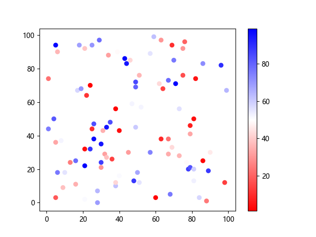# 这三行代码使编译器能够绘图: import sys import matplotlib matplotlib.use('Agg') import matplotlib.pyplot as plt import numpy as np # 生成随机数据点 x = np.random.randint(100, size=(100)) y = np.random.randint(100, size=(100)) colors = np.random.randint(100, size=(100)) # 使用 bwr_r 配色方案绘制蓝白红反向渐变色散点图: plt.scatter(x, y, c=colors, cmap='bwr_r') plt.colorbar() plt.show() # 这两行代码使编译器能够输出图形: plt.savefig(sys.stdout.buffer) sys.stdout.flush()
