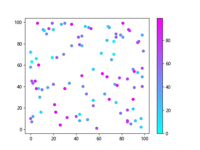 # 这三行代码使编译器能够绘图: import sys import matplotlib matplotlib.use('Agg') import matplotlib.pyplot as plt import numpy as np # 生成随机数据 x = np.random.randint(100, size=(100)) y = np.random.randint(100, size=(100)) colors = np.random.randint(100, size=(100)) # 使用 cool 配色方案绘制冷色调渐变色散点图: plt.scatter(x, y, c=colors, cmap='cool') plt.colorbar() plt.show() # 这两行代码使编译器能够输出图形: plt.savefig(sys.stdout.buffer) sys.stdout.flush()