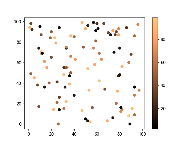 # 这三行代码使编译器能够绘图: import sys import matplotlib matplotlib.use('Agg') import matplotlib.pyplot as plt import numpy as np # 生成随机数据 x = np.random.randint(100, size=(100)) y = np.random.randint(100, size=(100)) colors = np.random.randint(100, size=(100)) # 使用 copper 配色方案绘制铜色渐变色散点图: plt.scatter(x, y, c=colors, cmap='copper') plt.colorbar() plt.show() # 这两行代码使编译器能够输出图形: plt.savefig(sys.stdout.buffer) sys.stdout.flush()