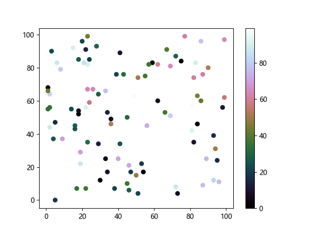 # 这三行代码使编译器能够绘图: import sys import matplotlib matplotlib.use('Agg') import matplotlib.pyplot as plt import numpy as np # 生成随机数据 x = np.random.randint(100, size=(100)) y = np.random.randint(100, size=(100)) colors = np.random.randint(100, size=(100)) # 使用 cubehelix 配色方案绘制螺旋立方体渐变色散点图: plt.scatter(x, y, c=colors, cmap='cubehelix') plt.colorbar() plt.show() # 这两行代码使编译器能够输出图形: plt.savefig(sys.stdout.buffer) sys.stdout.flush()