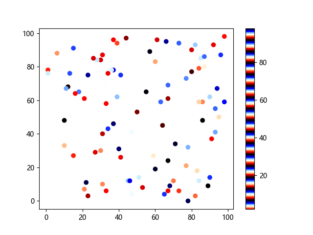 # 这三行代码使编译器能够绘图: import sys import matplotlib matplotlib.use('Agg') import matplotlib.pyplot as plt import numpy as np # 生成随机数据 x = np.random.randint(100, size=(100)) y = np.random.randint(100, size=(100)) colors = np.random.randint(100, size=(100)) # 使用 flag 配色方案绘制旗帜渐变色散点图: plt.scatter(x, y, c=colors, cmap='flag') plt.colorbar() plt.show() # 这两行代码使编译器能够输出图形: plt.savefig(sys.stdout.buffer) sys.stdout.flush()