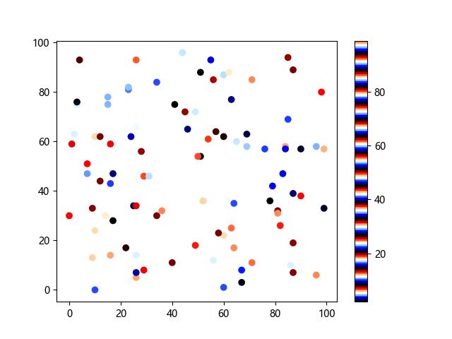# 这三行代码使编译器能够绘图: import sys import matplotlib matplotlib.use('Agg') import matplotlib.pyplot as plt import numpy as np # 生成随机数据点 x = np.random.randint(100, size=(100)) y = np.random.randint(100, size=(100)) colors = np.random.randint(100, size=(100)) # 使用 flag_r 配色方案绘制旗帜反向渐变色散点图: plt.scatter(x, y, c=colors, cmap='flag_r') plt.colorbar() plt.show() # 这两行代码使编译器能够输出图形: plt.savefig(sys.stdout.buffer) sys.stdout.flush()