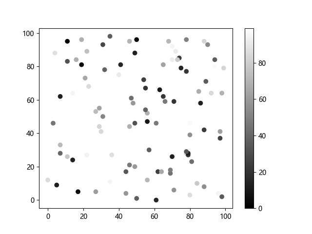 # 这三行代码使编译器能够绘图: import sys import matplotlib matplotlib.use('Agg') import matplotlib.pyplot as plt import numpy as np # 生成随机数据 x = np.random.randint(100, size=(100)) y = np.random.randint(100, size=(100)) colors = np.random.randint(100, size=(100)) # 使用 gist_gray 配色方案绘制灰度渐变色散点图: plt.scatter(x, y, c=colors, cmap='gist_gray') plt.colorbar() plt.show() # 这两行代码使编译器能够输出图形: plt.savefig(sys.stdout.buffer) sys.stdout.flush()