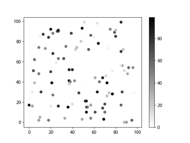 # 这三行代码使编译器能够绘图: import sys import matplotlib matplotlib.use('Agg') import matplotlib.pyplot as plt import numpy as np # 生成随机数据点 x = np.random.randint(100, size=(100)) y = np.random.randint(100, size=(100)) colors = np.random.randint(100, size=(100)) # 使用 gist_gray_r 配色方案绘制灰度反向渐变色散点图: plt.scatter(x, y, c=colors, cmap='gist_gray_r') plt.colorbar() plt.show() # 这两行代码使编译器能够输出图形: plt.savefig(sys.stdout.buffer) sys.stdout.flush()
