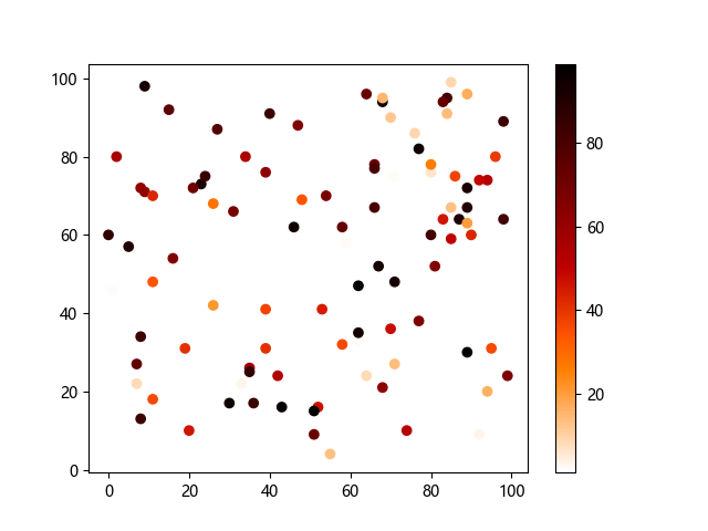 # 这三行代码使编译器能够绘图: import sys import matplotlib matplotlib.use('Agg') import matplotlib.pyplot as plt import numpy as np # 生成随机数据点 x = np.random.randint(100, size=(100)) y = np.random.randint(100, size=(100)) colors = np.random.randint(100, size=(100)) # 使用 gist_heat_r 配色方案绘制热力图反向渐变色散点图: plt.scatter(x, y, c=colors, cmap='gist_heat_r') plt.colorbar() plt.show() # 这两行代码使编译器能够输出图形: plt.savefig(sys.stdout.buffer) sys.stdout.flush()