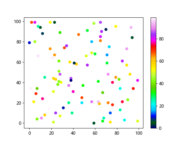 # 这三行代码使编译器能够绘图: import sys import matplotlib matplotlib.use('Agg') import matplotlib.pyplot as plt import numpy as np # 生成随机数据 x = np.random.randint(100, size=(100)) y = np.random.randint(100, size=(100)) colors = np.random.randint(100, size=(100)) # 使用 gist_ncar 配色方案绘制NCAR渐变色散点图: plt.scatter(x, y, c=colors, cmap='gist_ncar') plt.colorbar() plt.show() # 这两行代码使编译器能够输出图形: plt.savefig(sys.stdout.buffer) sys.stdout.flush()