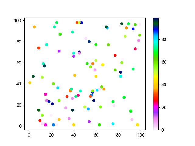 # 这三行代码使编译器能够绘图: import sys import matplotlib matplotlib.use('Agg') import matplotlib.pyplot as plt import numpy as np # 生成随机数据点 x = np.random.randint(100, size=(100)) y = np.random.randint(100, size=(100)) colors = np.random.randint(100, size=(100)) # 使用 gist_ncar_r 配色方案绘制 NCAR 反向渐变色散点图: plt.scatter(x, y, c=colors, cmap='gist_ncar_r') plt.colorbar() plt.show() # 这两行代码使编译器能够输出图形: plt.savefig(sys.stdout.buffer) sys.stdout.flush()