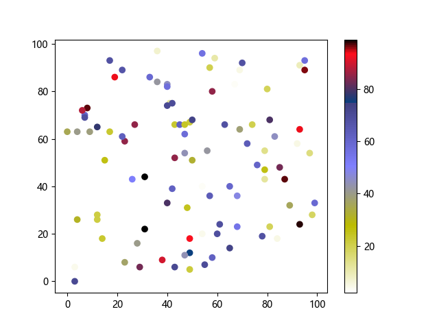 # 这三行代码使编译器能够绘图: import sys import matplotlib matplotlib.use('Agg') import matplotlib.pyplot as plt import numpy as np # 生成随机数据点 x = np.random.randint(100, size=(100)) y = np.random.randint(100, size=(100)) colors = np.random.randint(100, size=(100)) # 使用 gist_stern_r 配色方案绘制星云反向渐变色散点图: plt.scatter(x, y, c=colors, cmap='gist_stern_r') plt.colorbar() plt.show() # 这两行代码使编译器能够输出图形: plt.savefig(sys.stdout.buffer) sys.stdout.flush()