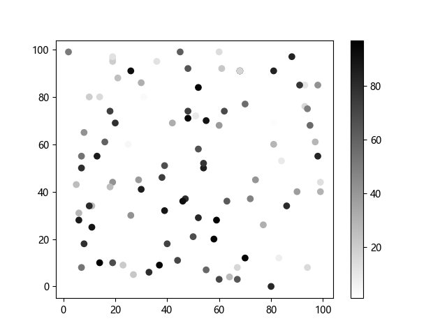 # 这三行代码使编译器能够绘图: import sys import matplotlib matplotlib.use('Agg') import matplotlib.pyplot as plt import numpy as np # 生成随机数据 x = np.random.randint(100, size=(100)) y = np.random.randint(100, size=(100)) colors = np.random.randint(100, size=(100)) # 使用 gist_yarg 配色方案绘制灰度渐变色散点图: plt.scatter(x, y, c=colors, cmap='gist_yarg') plt.colorbar() plt.show() # 这两行代码使编译器能够输出图形: plt.savefig(sys.stdout.buffer) sys.stdout.flush()