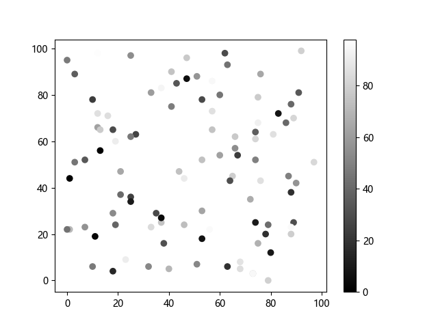 # 这三行代码使编译器能够绘图: import sys import matplotlib matplotlib.use('Agg') import matplotlib.pyplot as plt import numpy as np # 生成随机数据点 x = np.random.randint(100, size=(100)) y = np.random.randint(100, size=(100)) colors = np.random.randint(100, size=(100)) # 使用 gist_yarg_r 配色方案绘制灰度反向渐变色散点图: plt.scatter(x, y, c=colors, cmap='gist_yarg_r') plt.colorbar() plt.show() # 这两行代码使编译器能够输出图形: plt.savefig(sys.stdout.buffer) sys.stdout.flush()