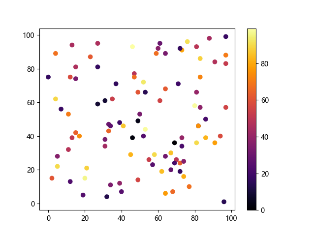 # 这三行代码使编译器能够绘图: import sys import matplotlib matplotlib.use('Agg') import matplotlib.pyplot as plt import numpy as np # 生成随机数据 x = np.random.randint(100, size=(100)) y = np.random.randint(100, size=(100)) colors = np.random.randint(100, size=(100)) # 使用 inferno 配色方案绘制地狱火渐变色散点图: plt.scatter(x, y, c=colors, cmap='inferno') plt.colorbar() plt.show() # 这两行代码使编译器能够输出图形: plt.savefig(sys.stdout.buffer) sys.stdout.flush()