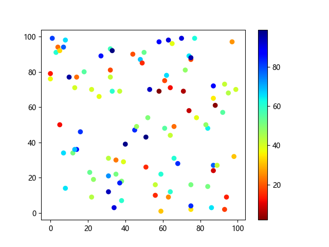 # 这三行代码使编译器能够绘图: import sys import matplotlib matplotlib.use('Agg') import matplotlib.pyplot as plt import numpy as np # 生成随机数据点 x = np.random.randint(100, size=(100)) y = np.random.randint(100, size=(100)) colors = np.random.randint(100, size=(100)) # 使用 jet_r 配色方案绘制 Jet 反向渐变色散点图: plt.scatter(x, y, c=colors, cmap='jet_r') plt.colorbar() plt.show() # 这两行代码使编译器能够输出图形: plt.savefig(sys.stdout.buffer) sys.stdout.flush()