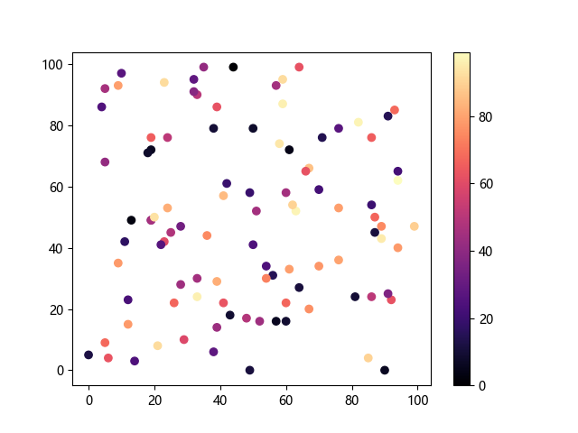 # 这三行代码使编译器能够绘图: import sys import matplotlib matplotlib.use('Agg') import matplotlib.pyplot as plt import numpy as np # 生成随机数据 x = np.random.randint(100, size=(100)) y = np.random.randint(100, size=(100)) colors = np.random.randint(100, size=(100)) # 使用 magma 配色方案绘制岩浆渐变色散点图: plt.scatter(x, y, c=colors, cmap='magma') plt.colorbar() plt.show() # 这两行代码使编译器能够输出图形: plt.savefig(sys.stdout.buffer) sys.stdout.flush()