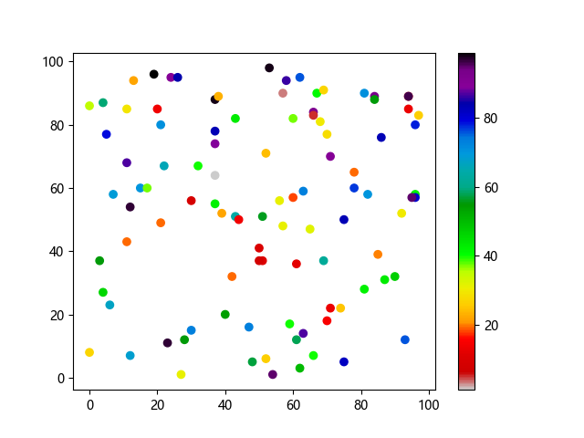 #Three lines to make our compiler able to draw: import sys import matplotlib matplotlib.use('Agg') import matplotlib.pyplot as plt import numpy as np x = np.random.randint(100, size=(100)) y = np.random.randint(100, size=(100)) colors = np.random.randint(100, size=(100)) plt.scatter(x, y, c=colors, cmap='nipy_spectral_r') plt.colorbar() plt.show() #Two lines to make our compiler able to draw: plt.savefig(sys.stdout.buffer) sys.stdout.flush()