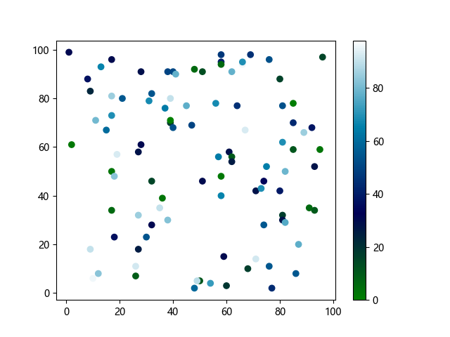 # 这三行代码使编译器能够绘图: import sys import matplotlib matplotlib.use('Agg') import matplotlib.pyplot as plt import numpy as np # 生成随机数据 x = np.random.randint(100, size=(100)) y = np.random.randint(100, size=(100)) colors = np.random.randint(100, size=(100)) # 使用 ocean 配色方案绘制海洋渐变色散点图: plt.scatter(x, y, c=colors, cmap='ocean') plt.colorbar() plt.show() # 这两行代码使编译器能够输出图形: plt.savefig(sys.stdout.buffer) sys.stdout.flush()
